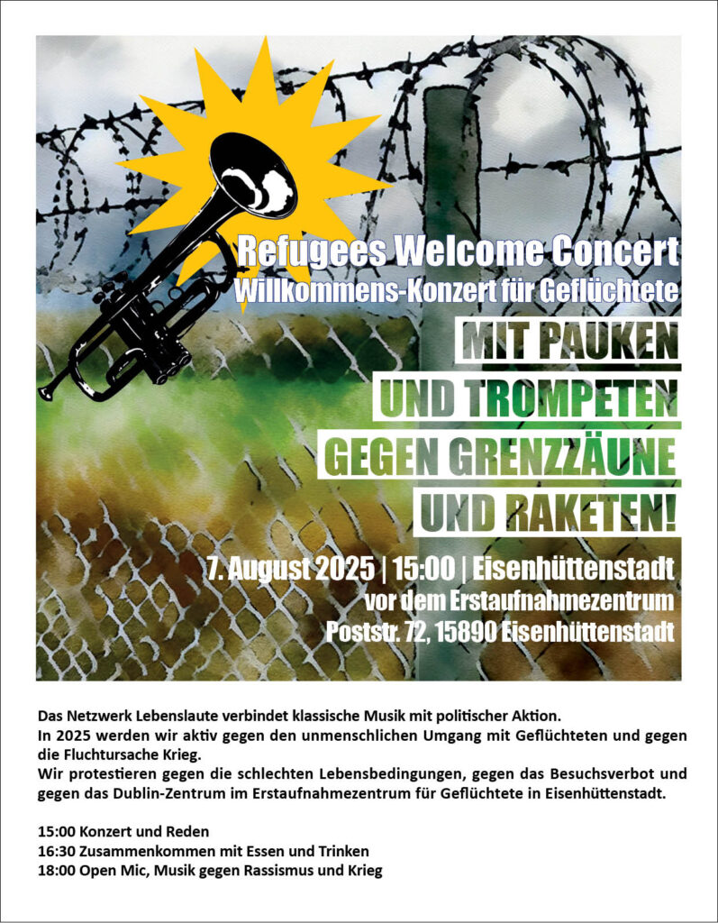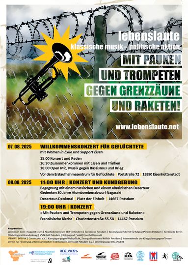 Unter dem Motto „Mit Pauken und Trompeten gegen Grenzzäune und Raketen“ findet am Samstag, dem 09. August von 11 bis 15 Uhr eine Kundgebung am „Denkmal für den Unbekannten Deserteur“ auf dem Platz der Einheit statt. 19 Uhr gibt es dann das große Konzert in der Französischen Kirche am Bassinplatz.